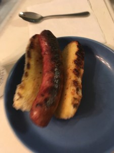 I already addressed the need for a sturdy sausage roll or bakery-tough bun to stand up to the heat of the grill. If you’ve got to use a bread knife to split them open, that’s a good sign. I make sure not to separate the two halves when I cut them, instead, leaving them connected like a good “slipper shell” you might uncover on a walk down the beach.