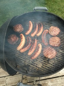 On a recent Sunday I added some burger patties to the smorgasbord, and placed them on the outer edges while arranging the eight brats in the center, straggling the grate lengthwise so they’d get some gorgeous grill marks.