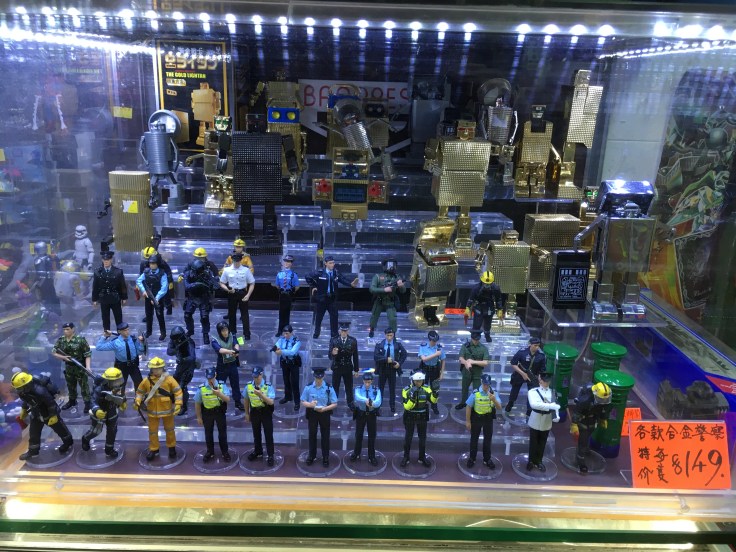 There’s a lot that’s repeated from stall to stall: scores of toy vehicles, ubiquitous cases of Pokemon cards, all the popular Legos and Transformers and Marvel superhero figurines I could likely find at home or online for less. I was after the odd and interesting, the local: Hong Kong buses and taxis and trams; (maybe) figures of local policemen and fireman and soldiers; a knock-off Chinese Lego policeman-chases-robber set that looked sturdy enough; elaborate Star Wars models to challenge the preteen in the house.