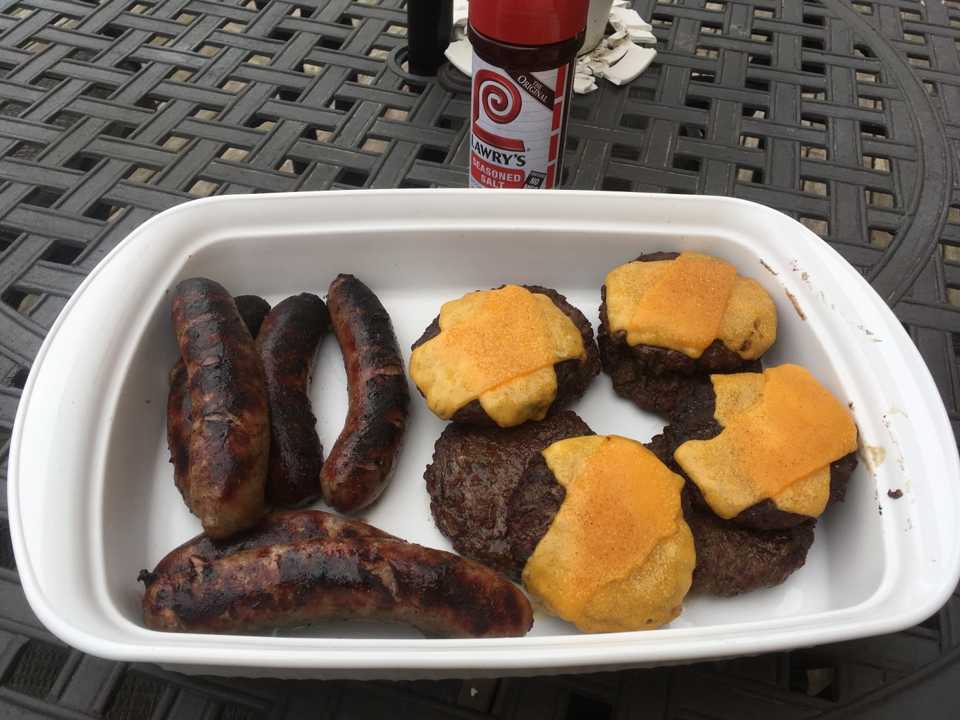 I started with a post-church lunch of brats and burgers. Going lowkey, and not subjecting the brats to my drawn out ritual, instead tossing them on dry and unbasted. The burgers, I bought preshaped, dusted a side with some spices, and just threw them both across the grate with the lid on and time enough to get juicy and hot.
