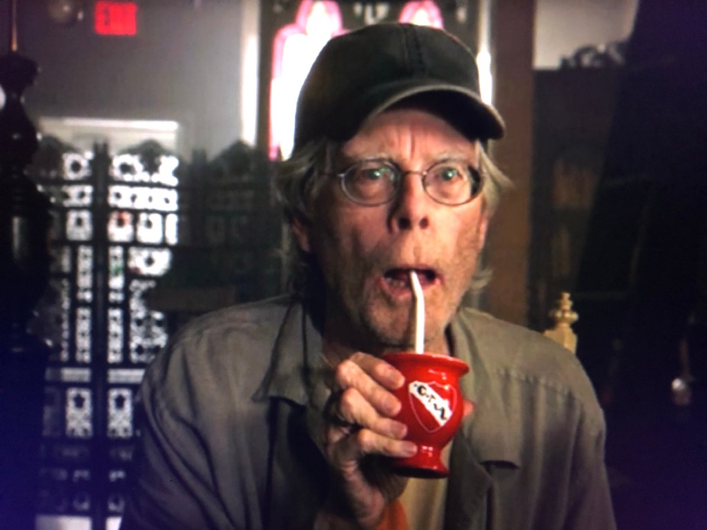 Consulting that source of easy sources, Google, I came across this article, mentioning that King was drinking yerba mate, and that the mug, or whatever — actually a mate — is independiente-themed, and something to do with director Andy Muschietti.