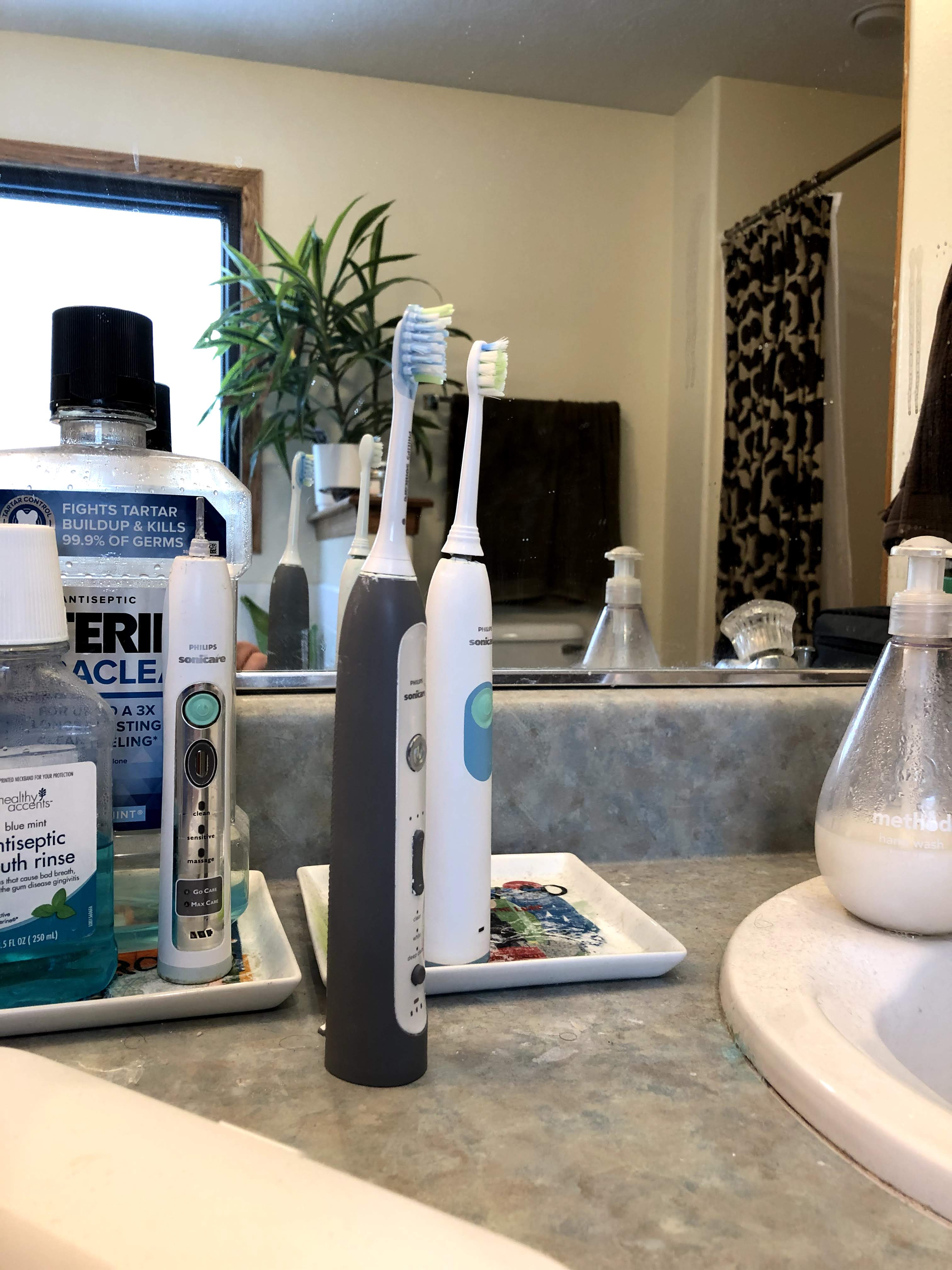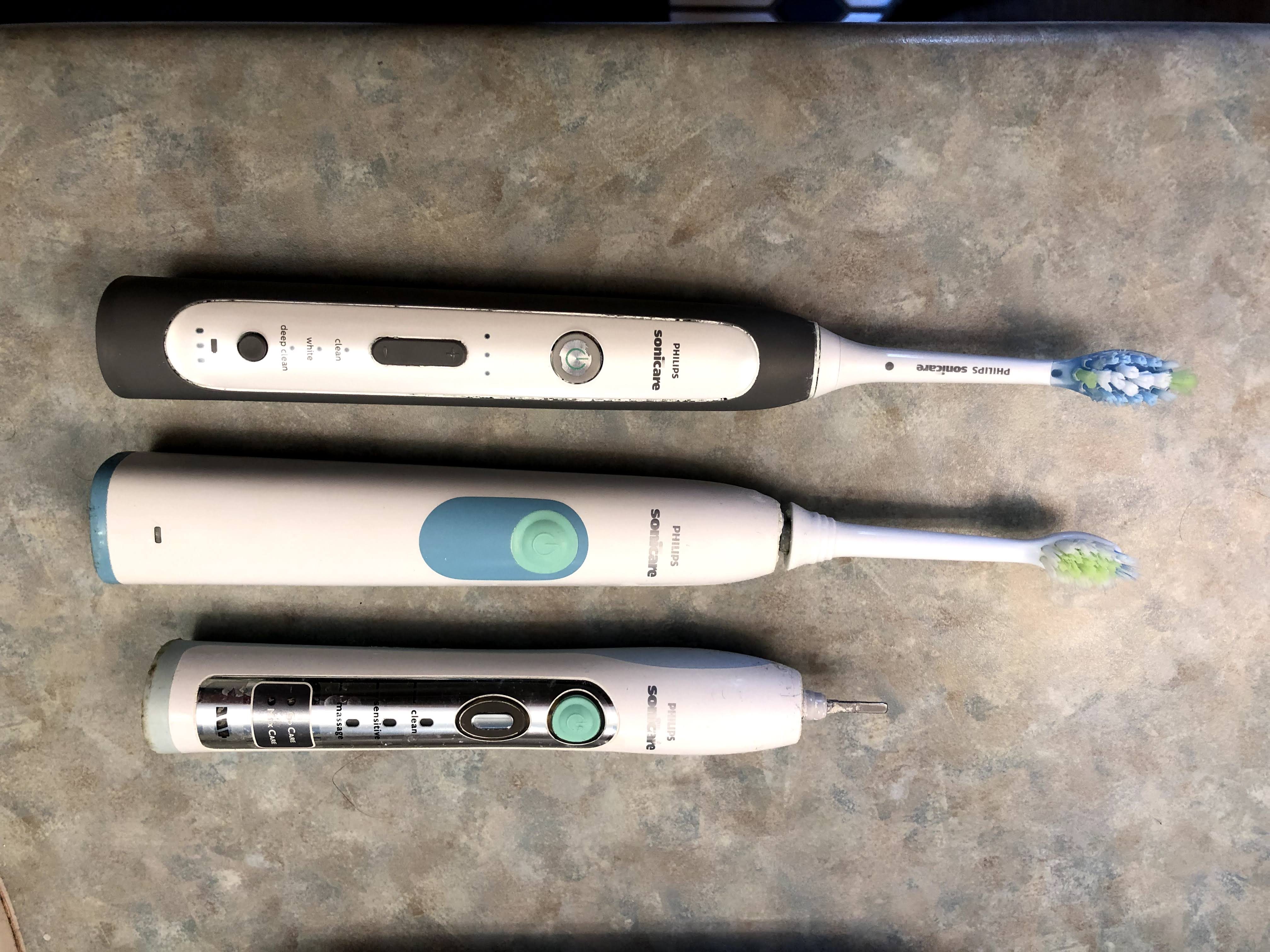 To wit: at last count, I had not one, not two, but three Philips Sonicare models of various vintage standing sentry on my side of the bathroom vanity, while my wife’s lone toothbrush, sleek and clean and in no way showing its age, fixed them in its doleful glare from her equally clean and pristine sink.
